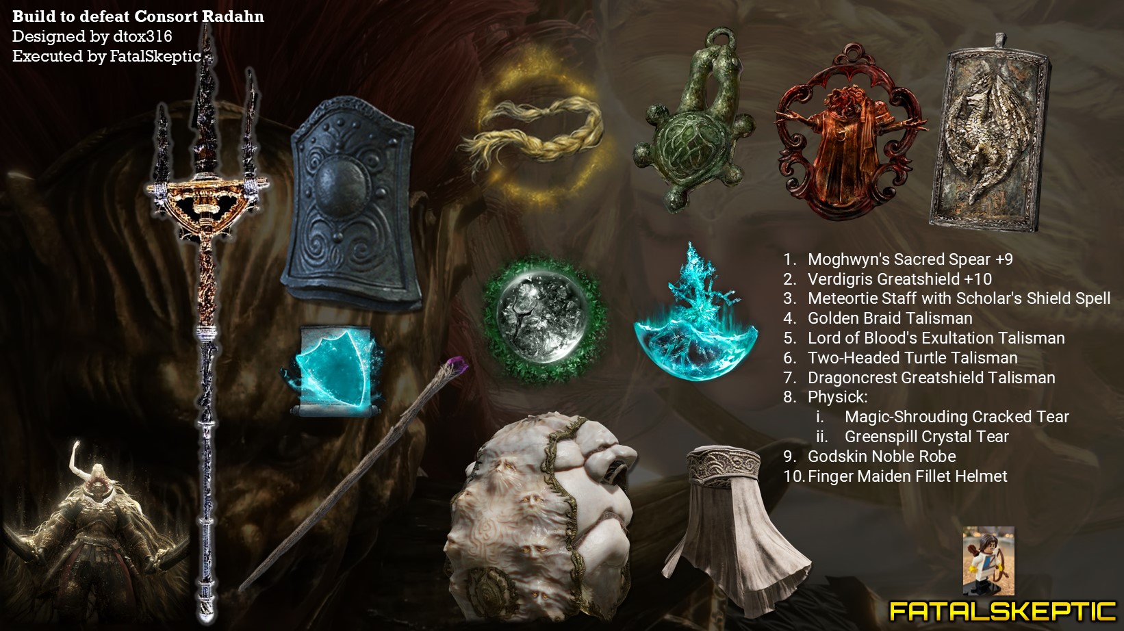 After watching me miserably fail 876 times against the Promised Consort Radahn, my friend @dtox316 created a custom build based on items I had. Here’s the definitive build that’ll easily beat the Consort while still making you work a bit (managing your stamina mostly, and dodging a few attacks)